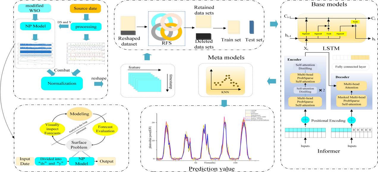 (DOI: 10.1016/j.renene.2025.122687)针对太阳能发电的随机性及周期性趋势特征不足的问题,提出了一种基于 Stacking 集成算法的中期光伏功率预测混合模型 WNPS-LSTM-Informer,有效提升了预测精度。