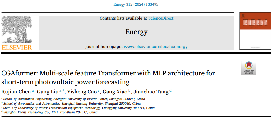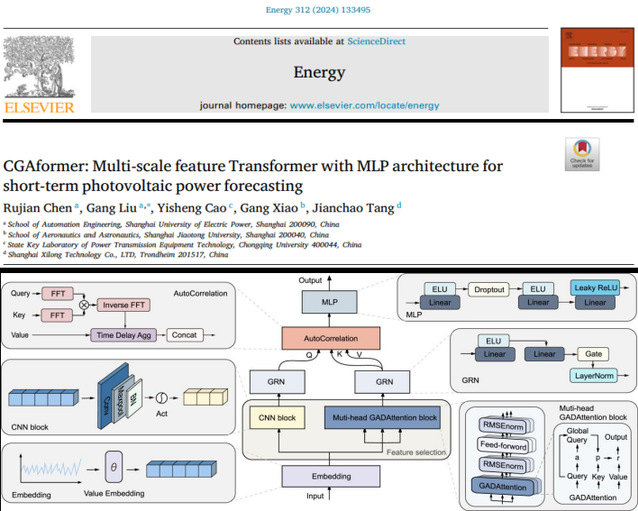 在《Energy》上发表的论文“CGAformer: Multi-scale feature Transformer with MLP architecture for short-term photovoltaic power forecasting”(DOI: 10.1016/j.energy.2024.133495)针对光伏发电的强波动性、高间歇性及明显周期性特点,提出了基于一维卷积神经网络、全局累加注意力和自相关的混合模型 CGAformer,用于短期光伏功率预测,实现了多尺度特征的高效捕获。