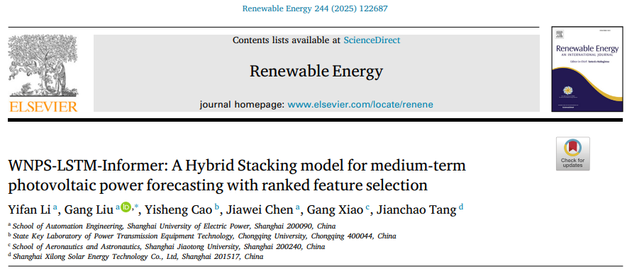 在《Renewable Energy》上发表的论文“WNPS-LSTM-Informer: A Hybrid Stacking model for medium-term photovoltaic power forecasting with ranked feature selection”