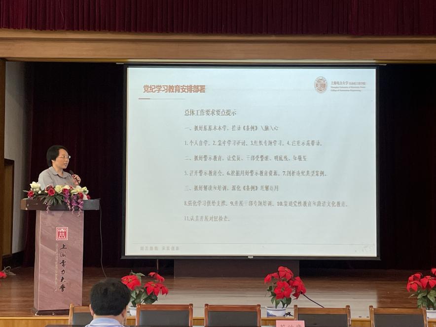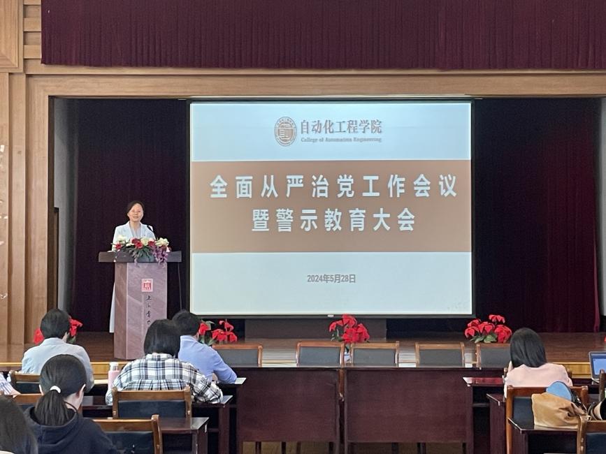 党纪学习教育是中国共产党加强纪律建设、推动全面从严治党向纵深发展的重要举措,为进一步推动党纪学习教育落实落细见行见,5月28日自动化工程学院在杨浦校区小礼堂召开了全面从严治党工作会议暨警示教育大会,学院党政领导班子成员及全体教师参加大会,会议由学院党委副书记王佳丽主持。